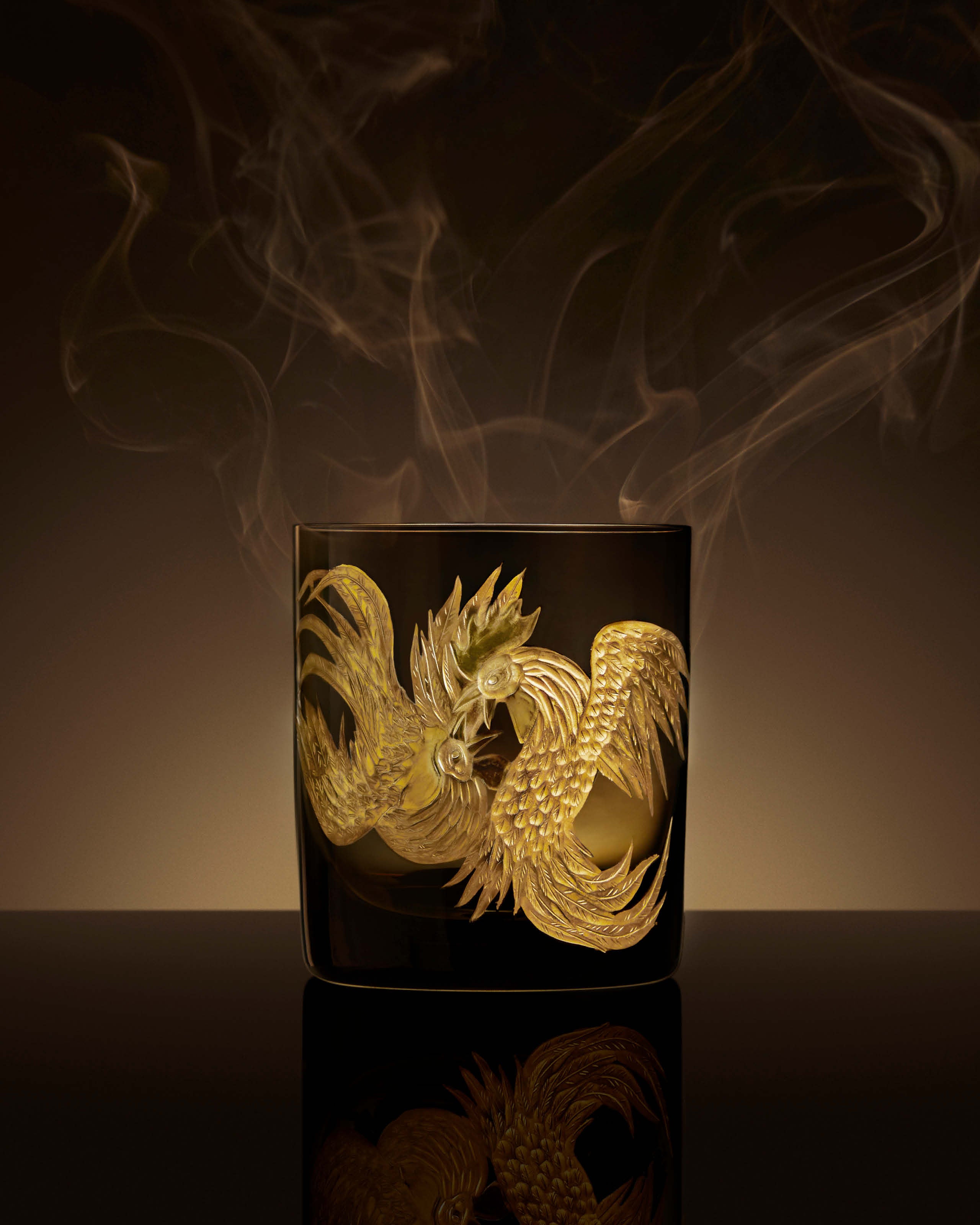 The Cock Fight Double Old Fashioned glass with luxurious gold gilding, is crafted from Smoke coloured crystal, hand engraved with the Cock Fight motif.