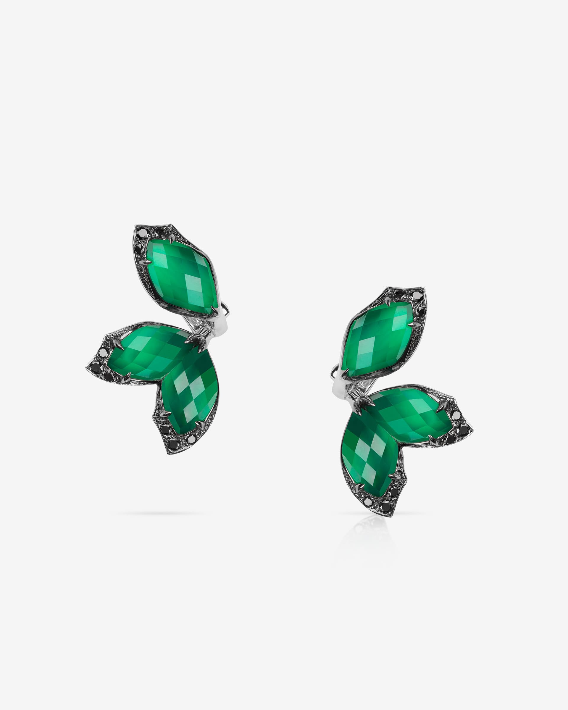 Inspired by the ultimate game of chance, the Crystal Haze Chance Earrings, are handcrafted from 18ct White Gold, with Green Agate and Quartz Crystal Haze and Black Diamond pavé.