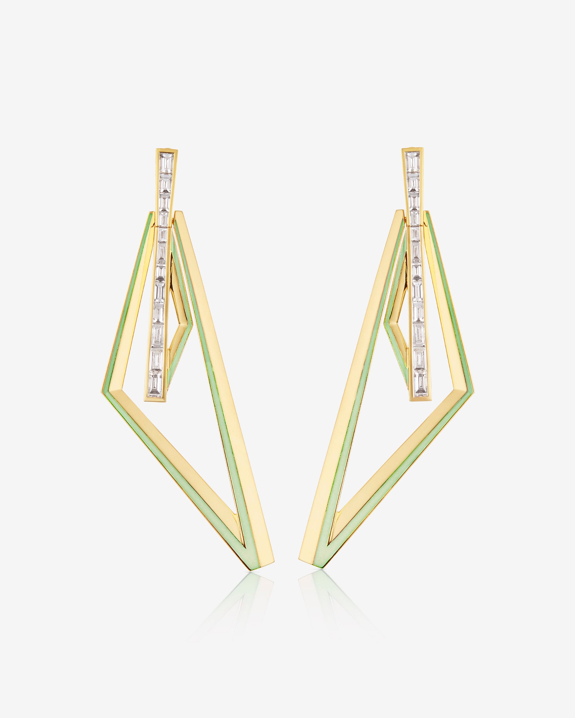 Creating an illusion of depth and dimension; the versatile Vertigo Obtuse Hoops are crafted in 18ct Yellow Gold with vibrant Neon Lime enamel and accentuated with white baguette Diamonds and white Diamond pavé on a detachable hoop.