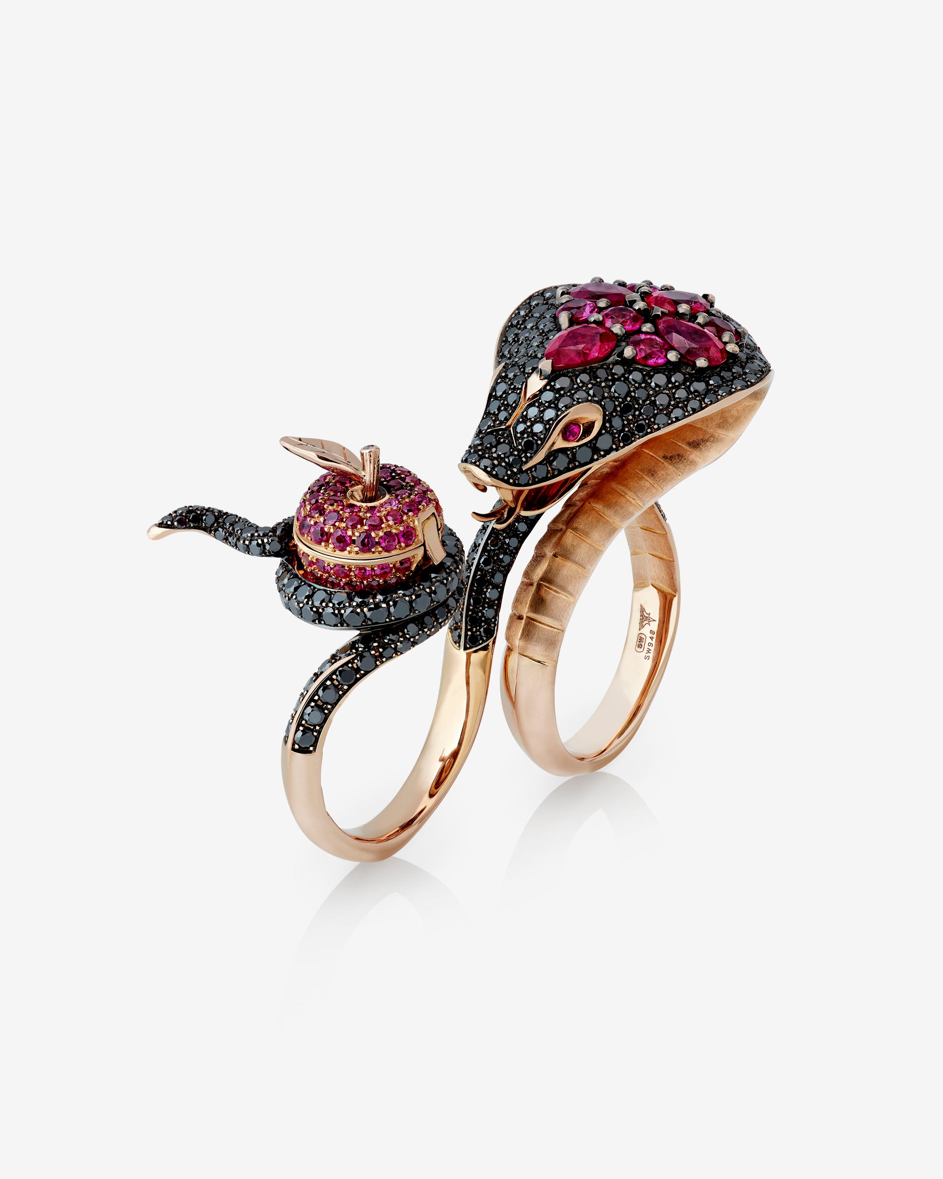 Temptation at your fingertips, the Eve Ring is meticulously handcrafted in 18ct rose gold with black diamond pavè, pear-shape and round rubies and a single white diamond at the tip of the apple's stalk.