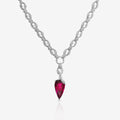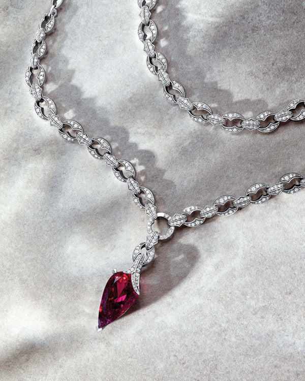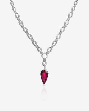 A darkly romantic necklace, the Pear Drop Necklace is set with a pear-shaped Rubellite depicting Hollywood glamour surrounded by a linked chain of White Diamond pavé thorns in recycled 18ct White Gold.