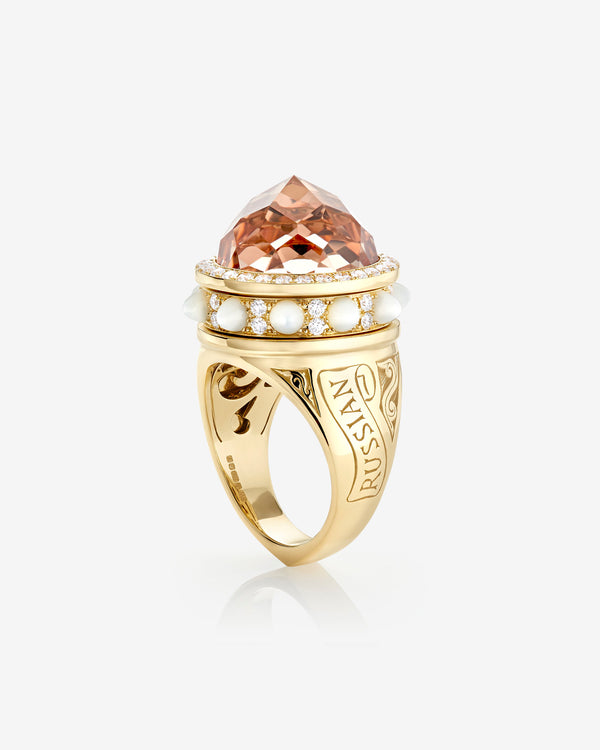 Featuring a central Morganite set in 18ct yellow Gold, our Russian Roulette Bullet Ring is finished with white Diamond pavé and White Mother of Pearl bullets.