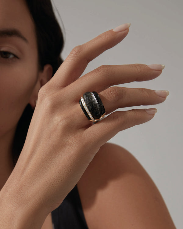 Embodying the Stephen Webster bold aesthetic, the Amplified Cocktail Ring is crafted in 18ct Yellow Gold and set with Silver Obsidian Crystal Haze and White Baguette Diamonds for the ultimate monochromatic look.