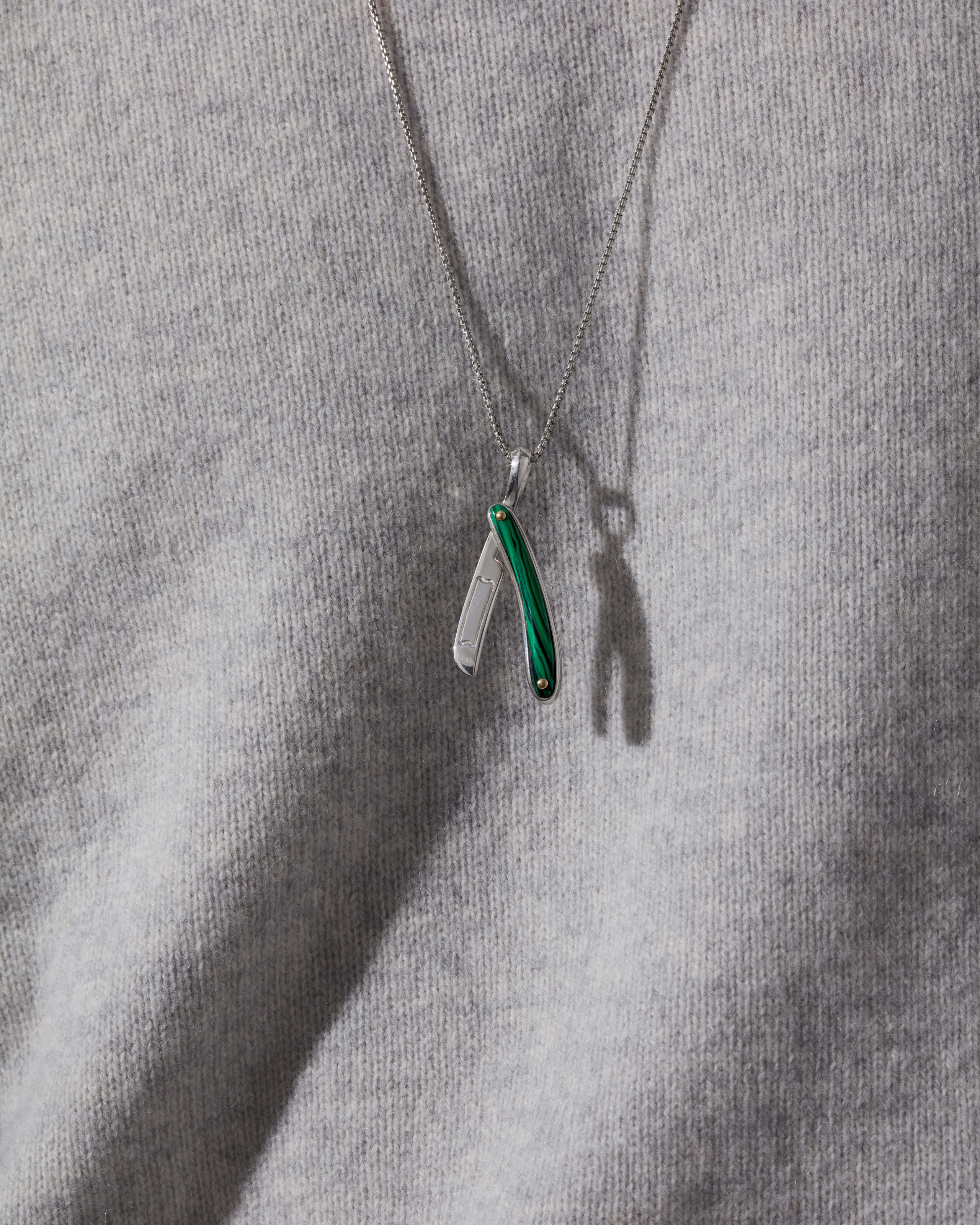 Crafted in Sterling Silver with a Malachite Inlay, our Switchblade Pendant has all the characteristics of a Webster piece, making it instantly identifiable.