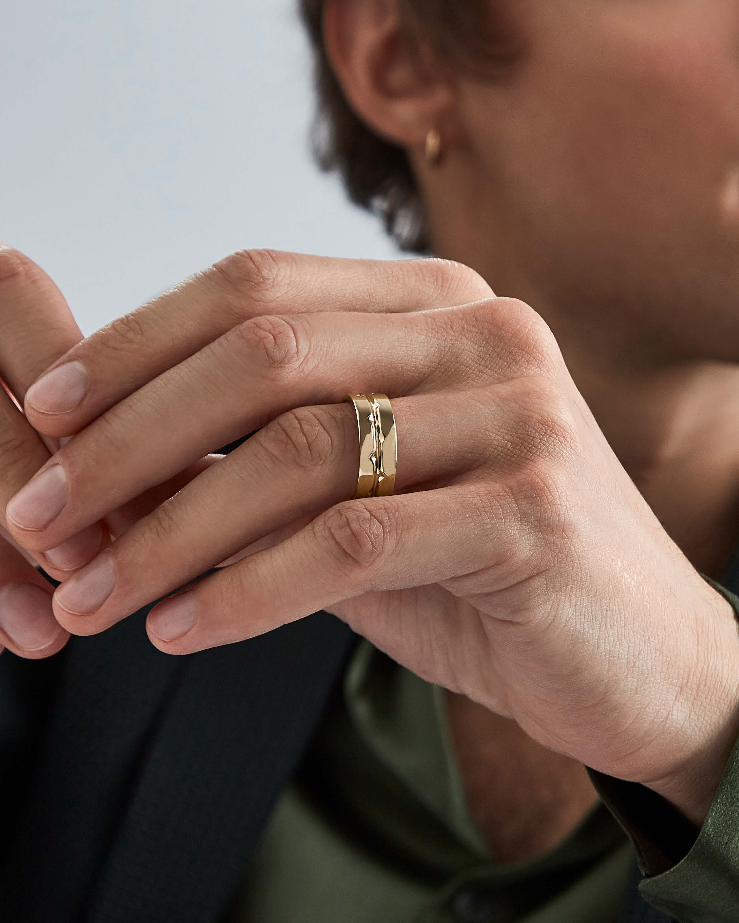 • Model wearing Stephen Webster Thorn Inscription Band in 18 k yellow gold