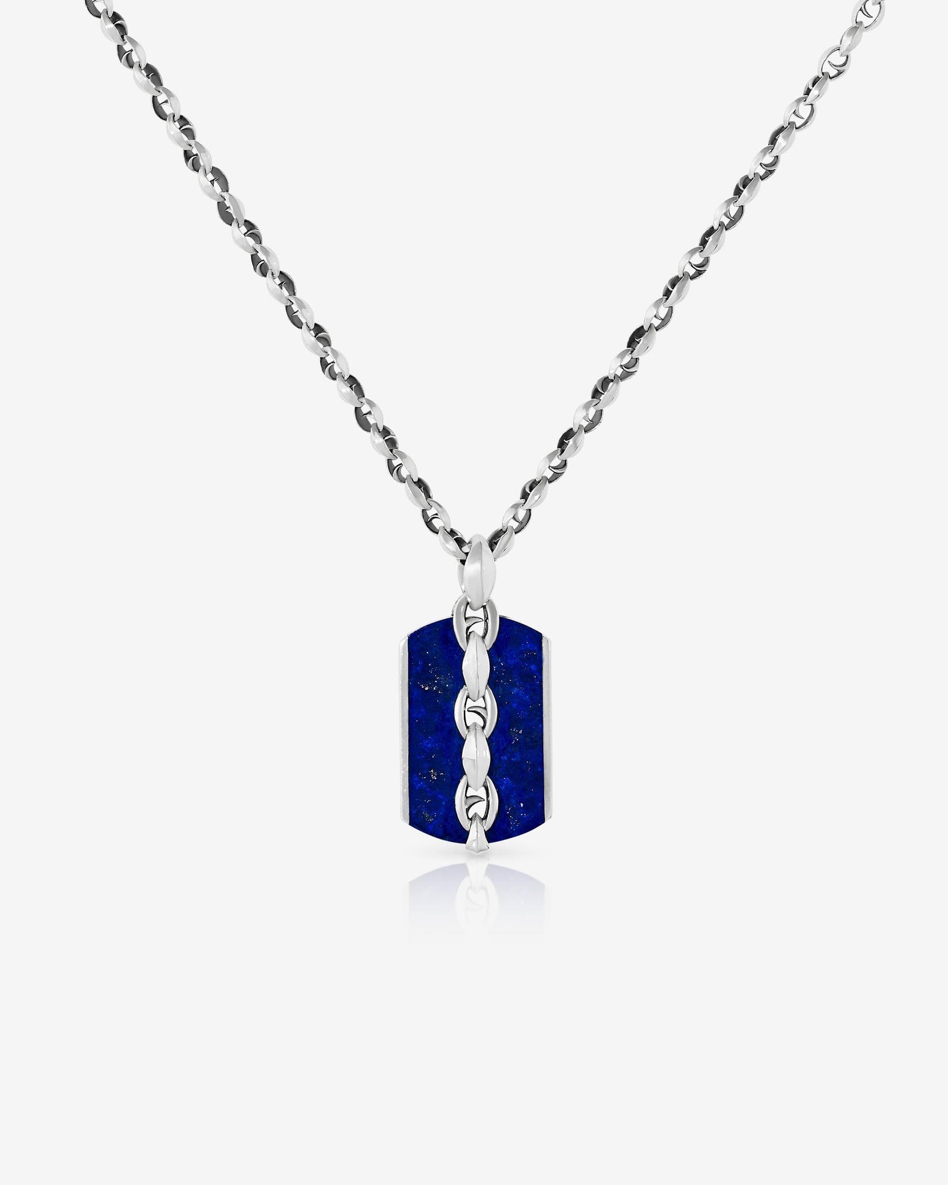 Add an injection of colour to your look with the Large Razer Tag featuring Lapis inlay with the Thorn chain motif in the centre or refresh the look by reversing the Dog Tag to reveal an engraved Thorn design, all set in recycled Sterling Silver on a 19-inch Thorn Small Link Chain.