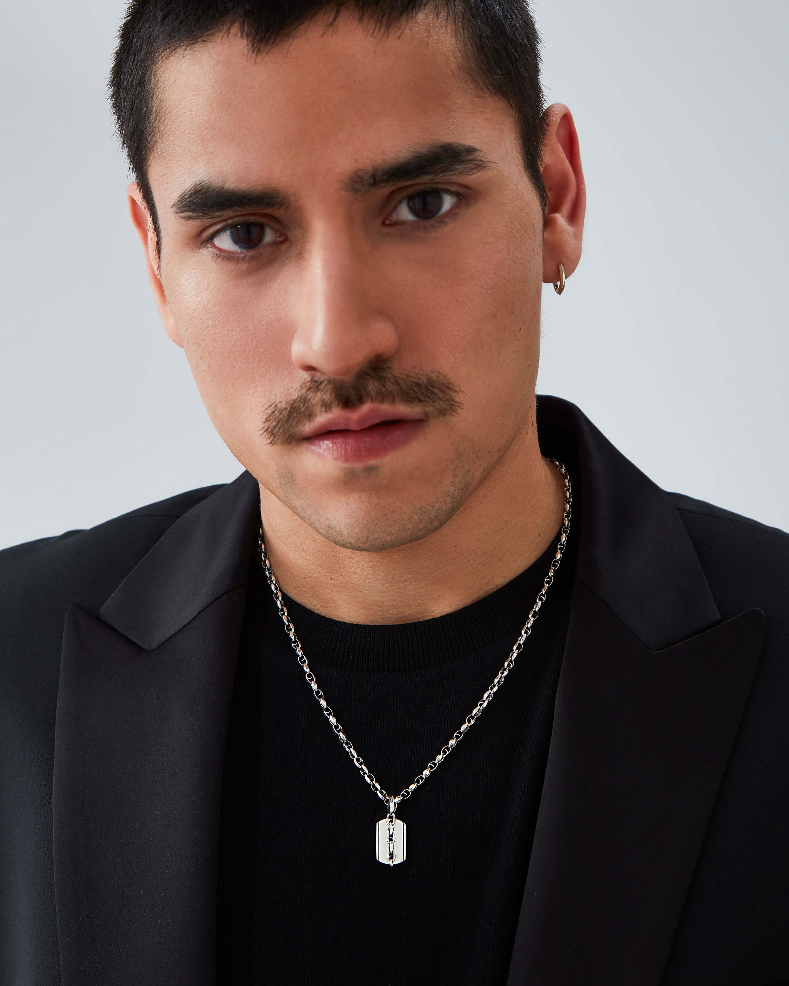 Wear on its own or layer up with a chain, the Medium Razer Tag features the Thorn chain motif with an engraved Thorn design on the reversible Sterling Silver Dog Tag on a 19-inch Thorn Small Link chain.