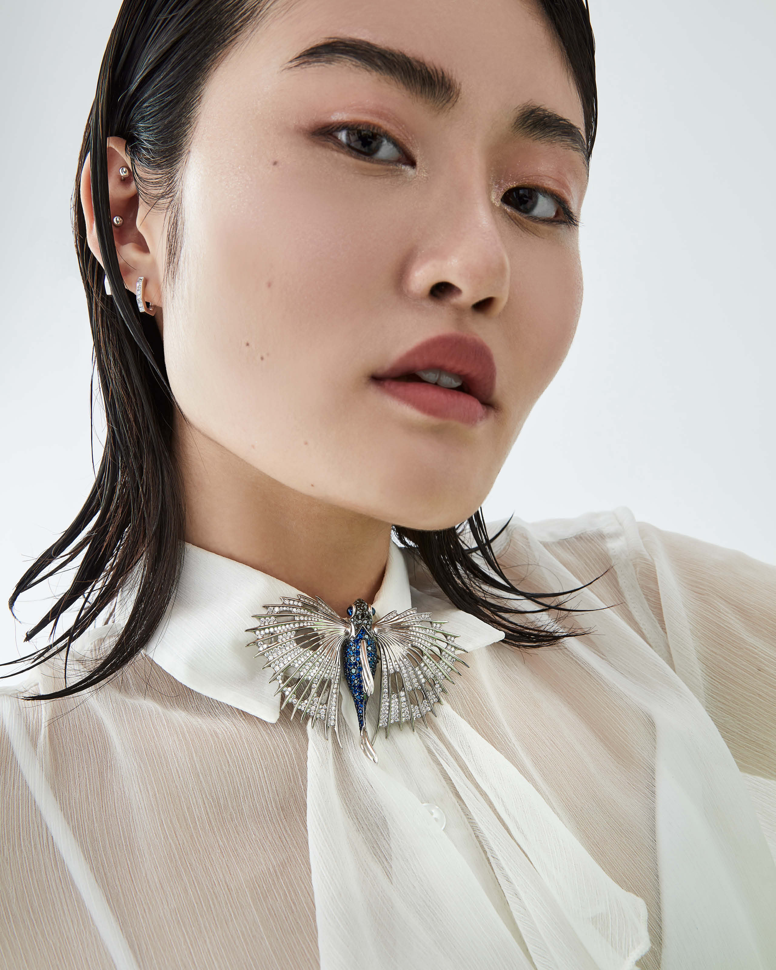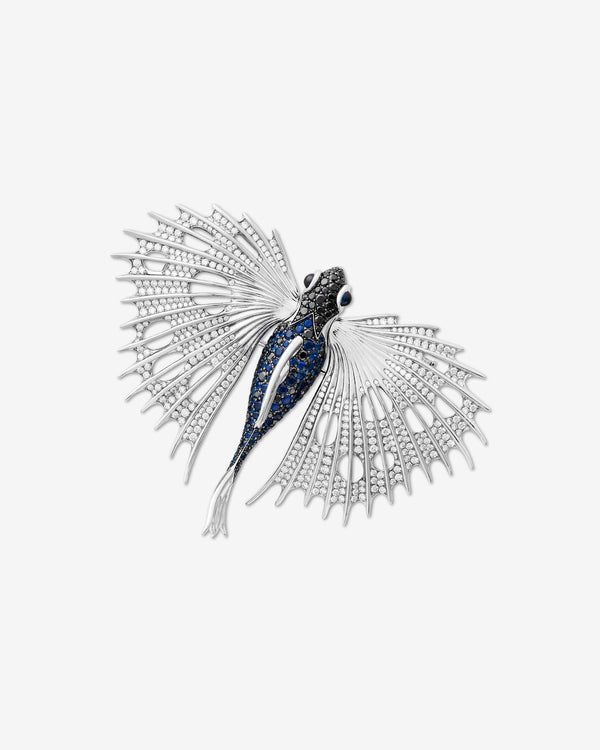 Reimagined for the No Regrets Capsule collection, the Flying Fish Brooch features a mix of blue Sapphires and black Diamonds with blue Sapphire cabochon eyes on a 18ct white Gold body, and white Diamonds on Titanium wings.