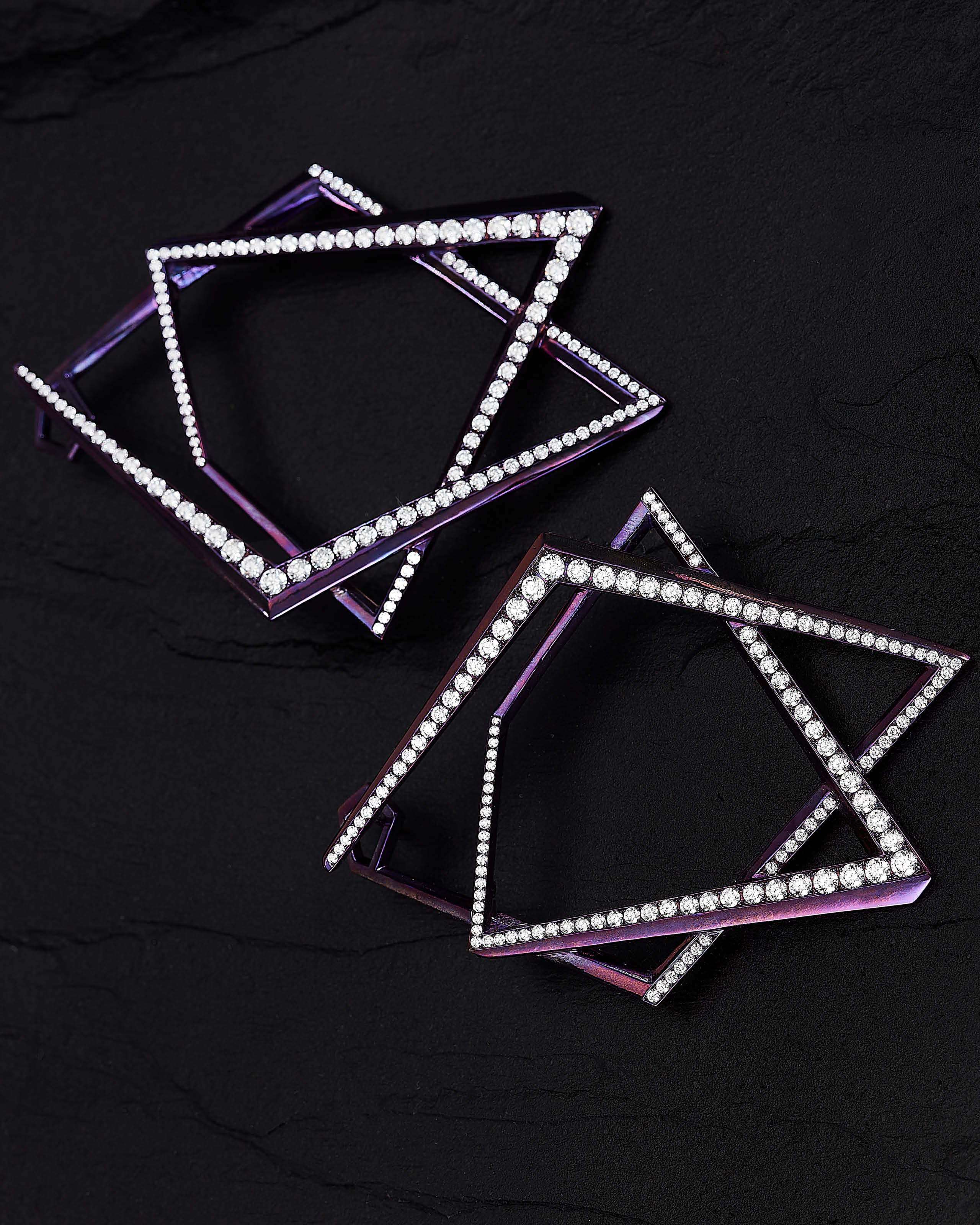 Modern and intriguing, Vertigo combines technology with tradition with mixed media materials of titanium and ceramic enamel, precious metals, diamonds and exotic baguette cut spinels. Vertigo is a collection of strong angular lines, bold colour and altered perspective set to challenge reality, creating an illusion of depth and dimension.