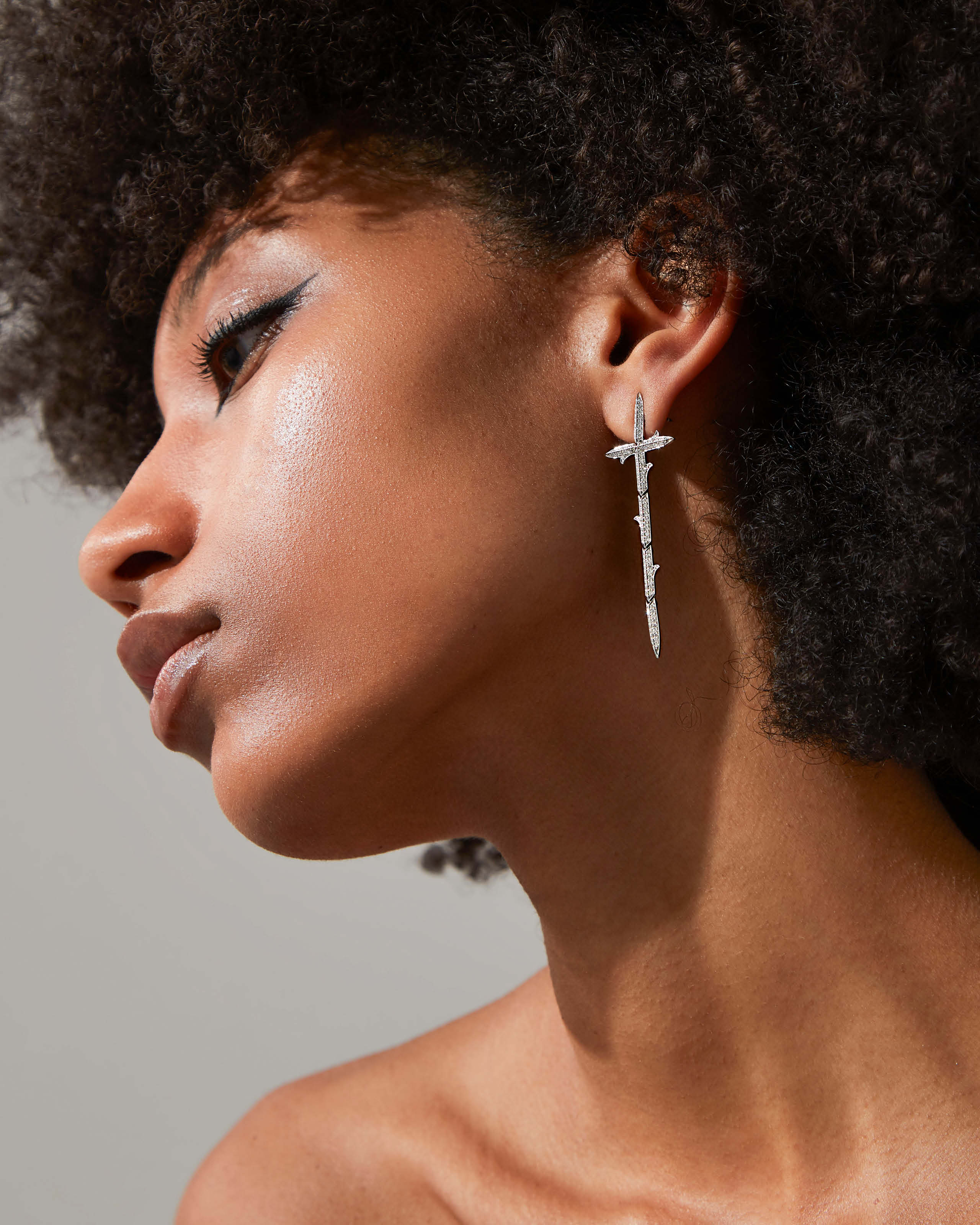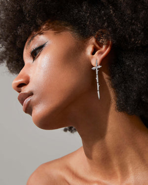 Full of movement, the single Very Cross Earring is designed to be worn asymetrically with separate White Diamond pavé thorns all set in 18ct recycled White Gold.