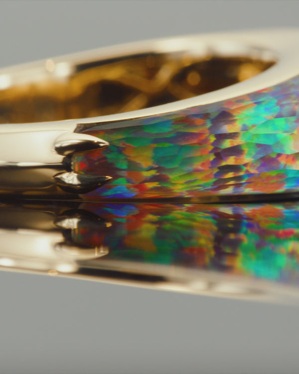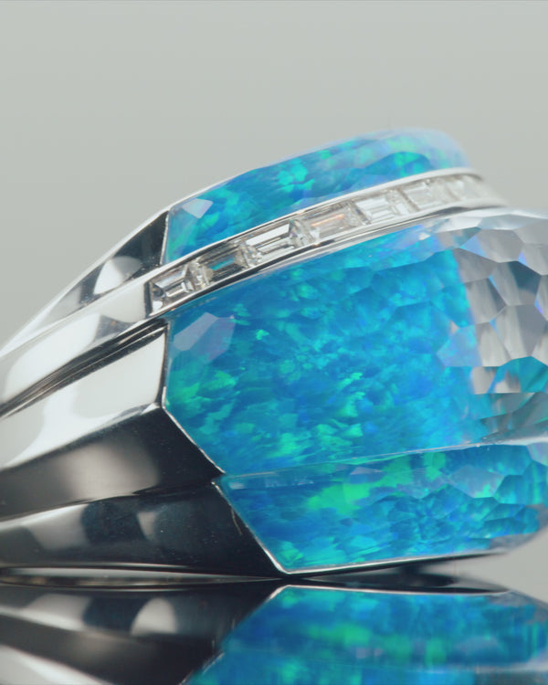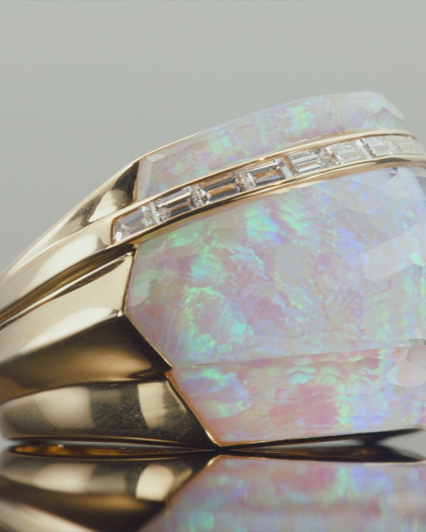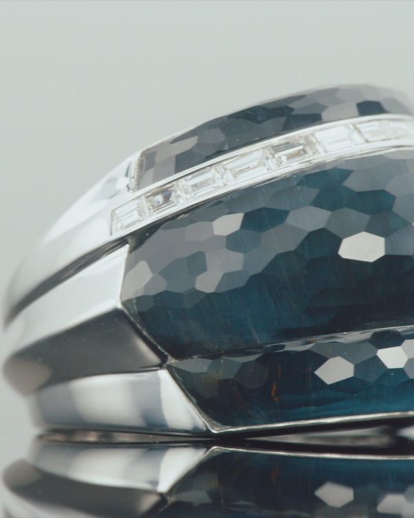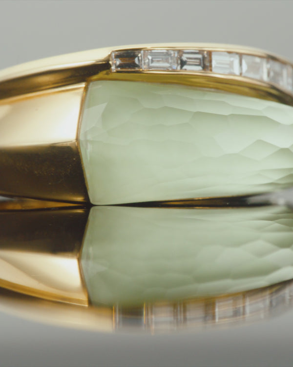 Crystal Haze is a concept achieved by bonding a high dome of clear multifaceted rock crystal over a thin layer of precious opaque stone.