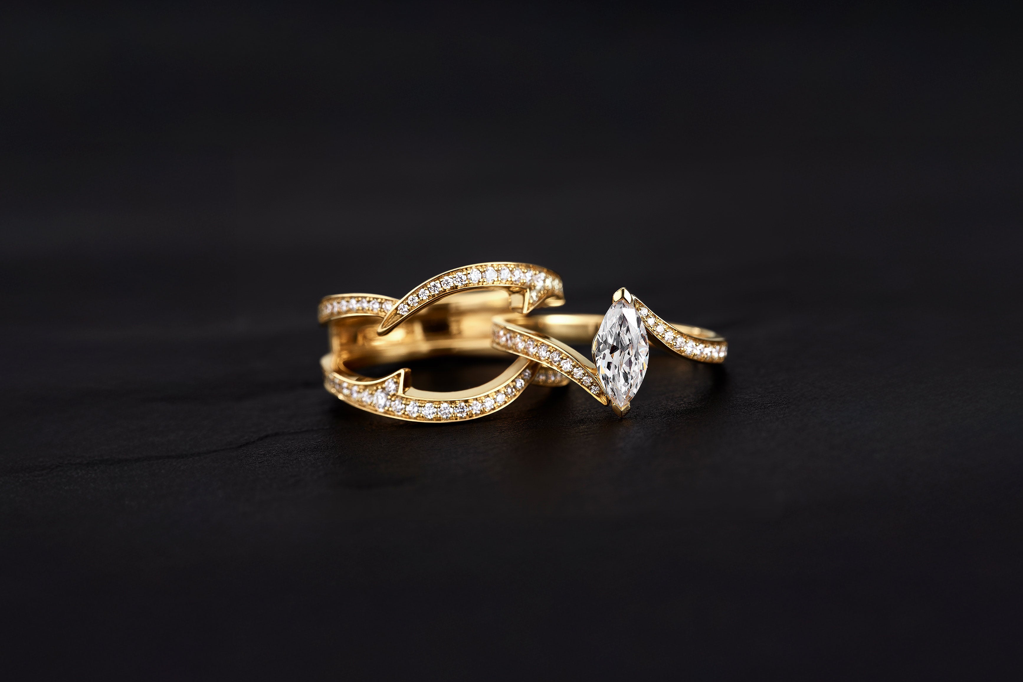 Stephen Webster introduces a twist of innovation with a magnetic mechanism embedded in each ring shank, allowing the two rings to be physically drawn to one another.