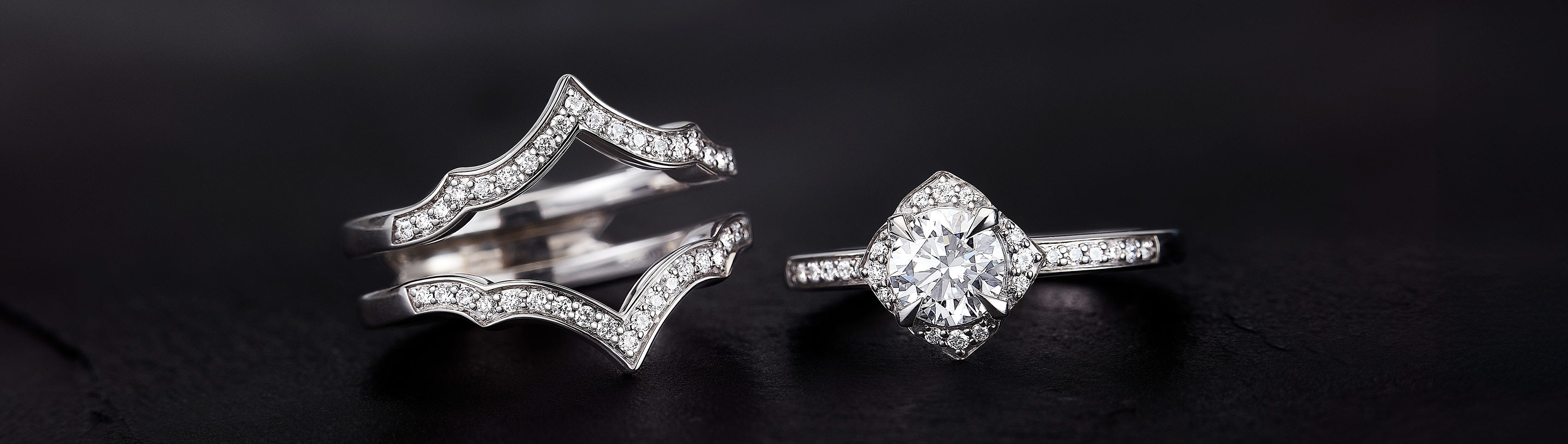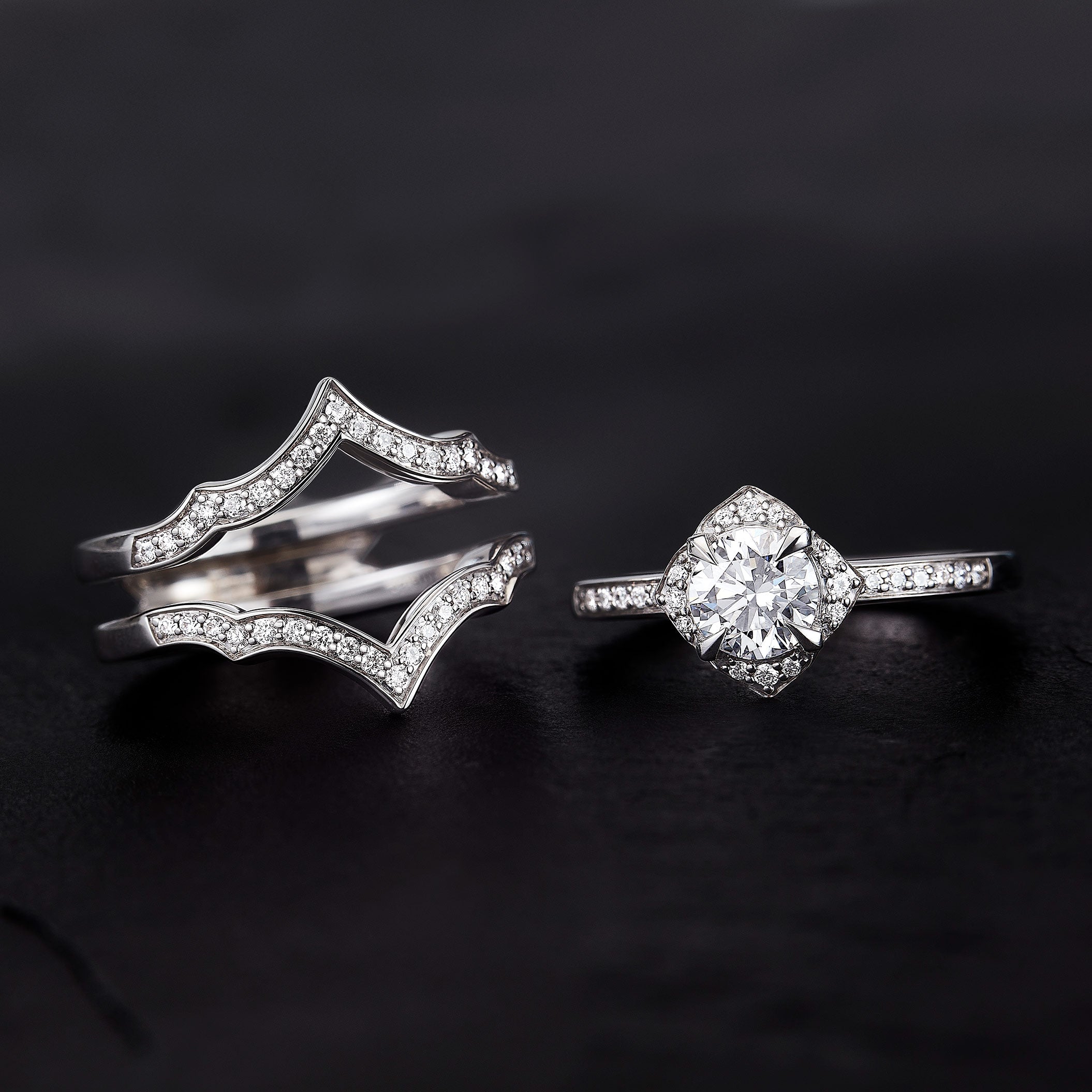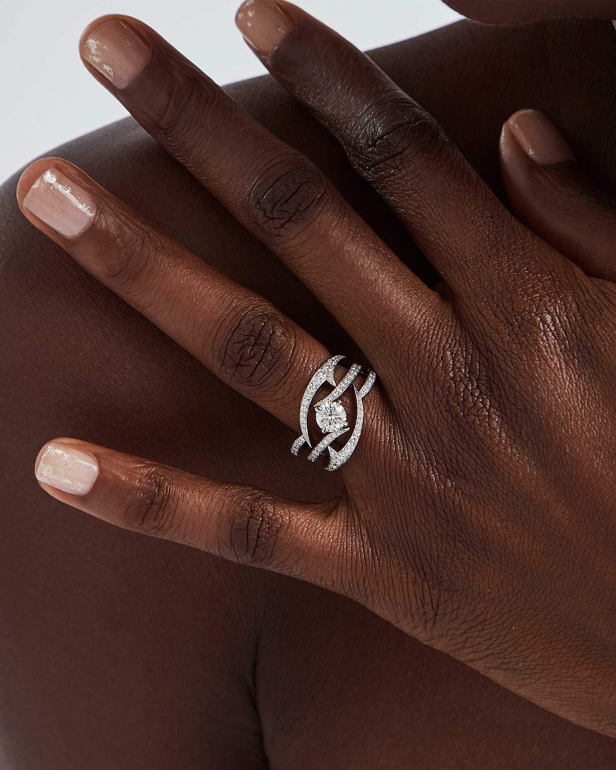 Rather than change perception, we embrace it, with the possibility of a ‘Party Jacket’. Unlike a Wedding Band, the ‘Party Jacket’ allows you to frame your engagement ring symmetrically, adding further volume and glamour to the piece. The concept enables the wearer to place a feature stone ring, into a separate outer ring, merging the two together as one piece.