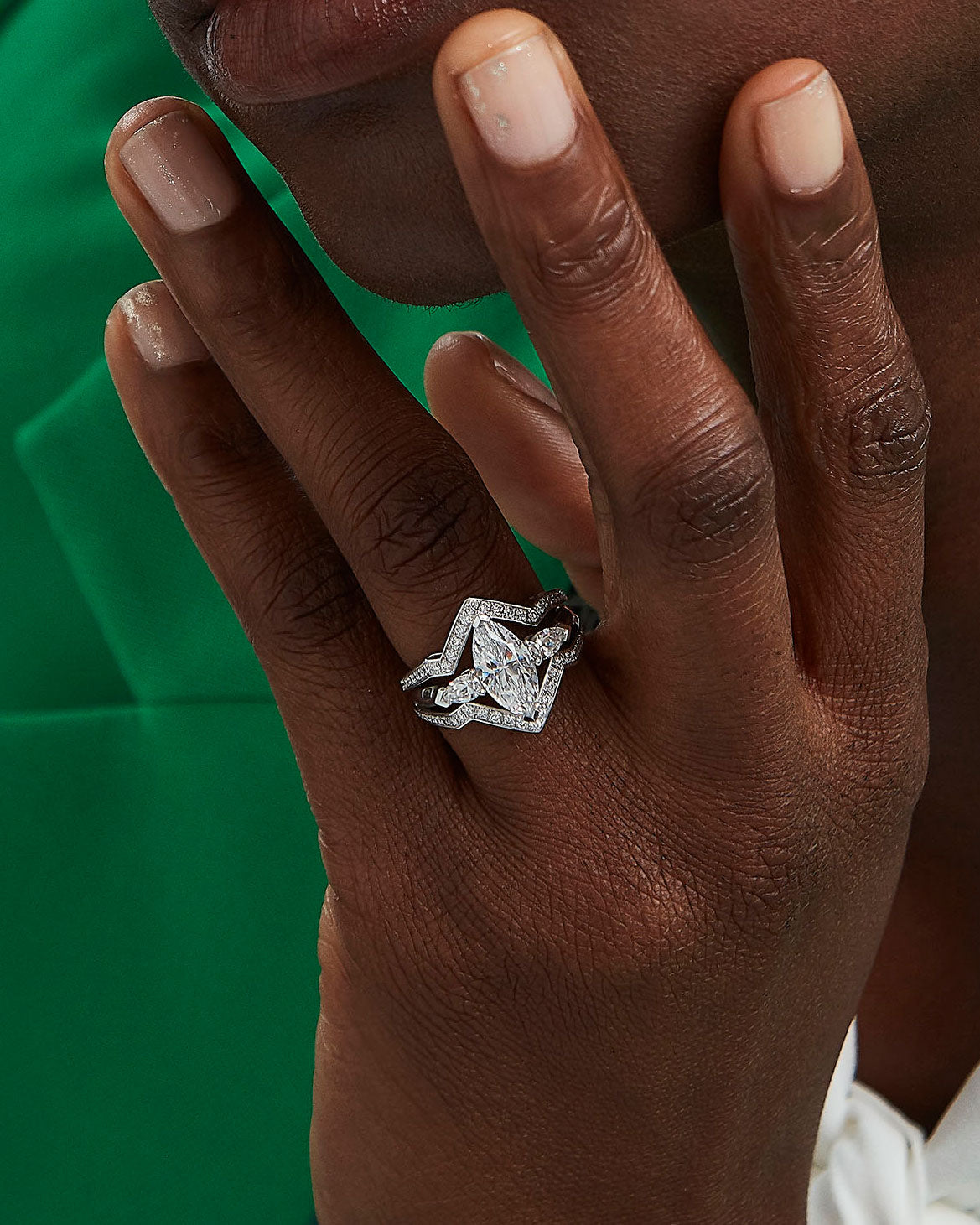 Our client came to us with her very simple solitaire marquise engagement ring, that she felt was missing a bit of ‘oomph’. Much to our delight, we were briefed to not hold back on the sparkle factor; so we ramped the design up a notch.