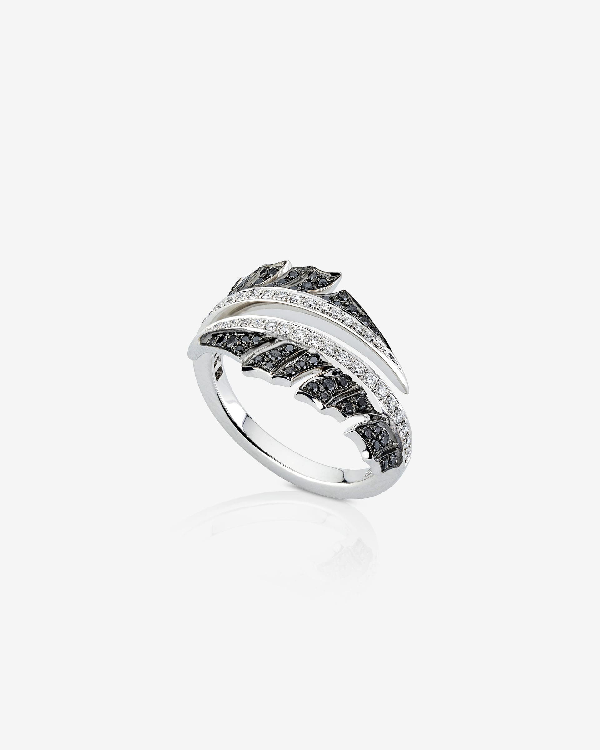 The captivating Plume Split Ring exemplifies nature’s beauty with White and Black Diamond pavé, inspired by the magnificent feathers of the English gamebird, the pheasant.