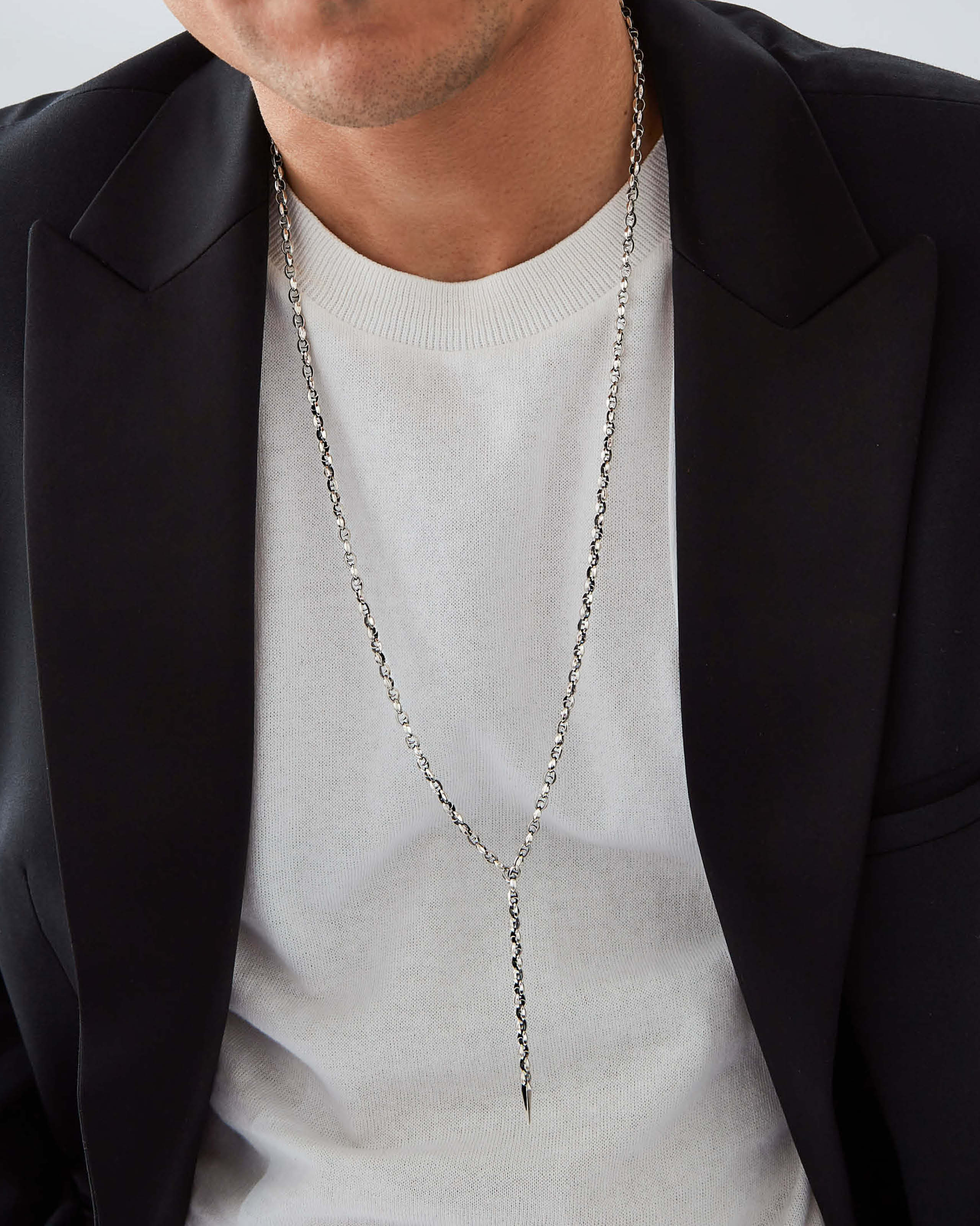 • Male model wearing Stephen Webster Classic Thorn silver lariat necklace — luxury men’s jewellery styling