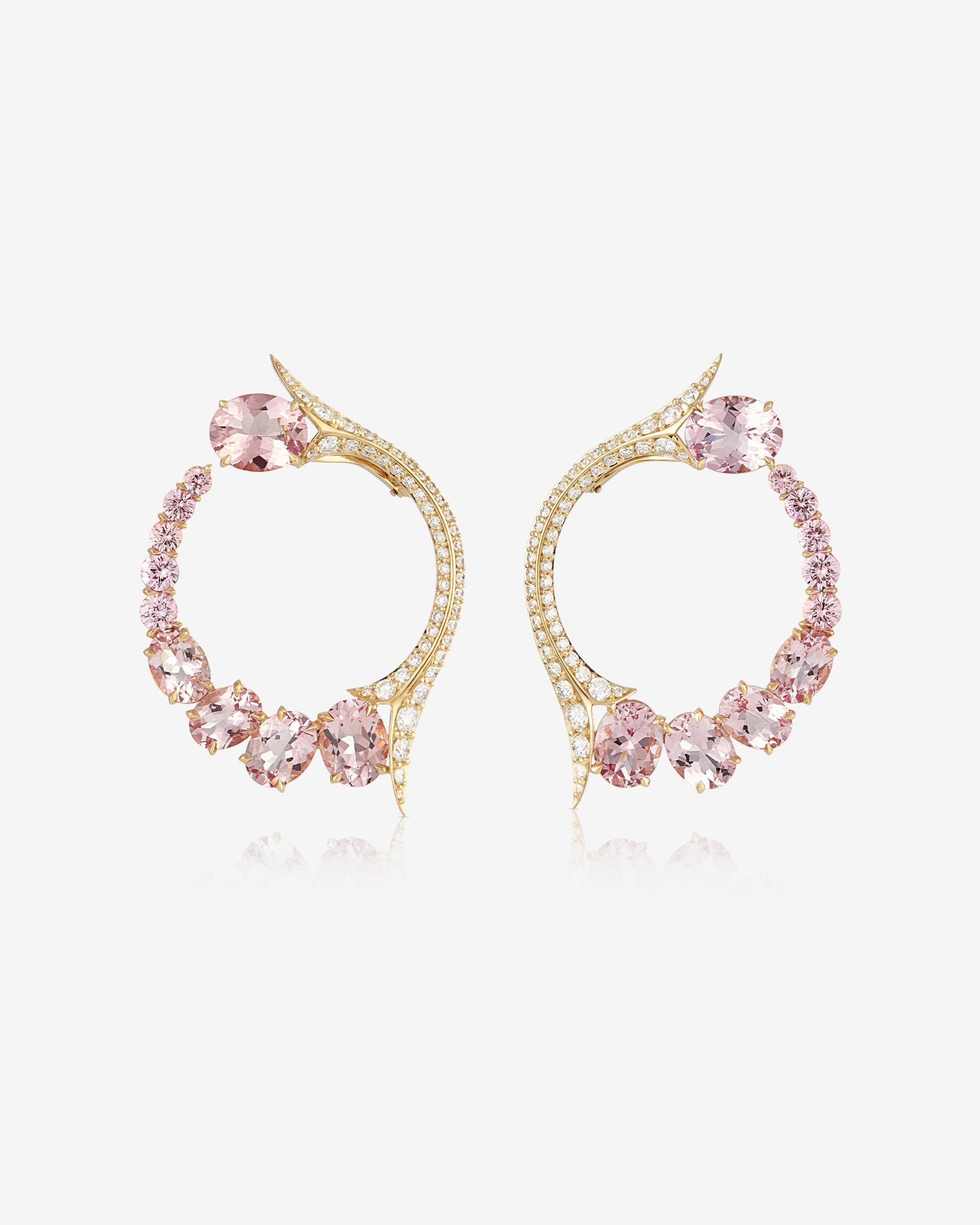 Dangerously glamourous; the Forbidden Fruit Hoop Earrings are set with oval-shaped Morganites and round light pink Sapphires, with White Diamond pavé thorns. Crafted in 18ct recycled Yellow Gold.