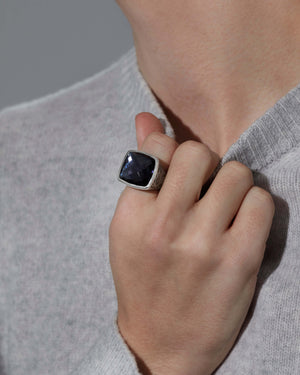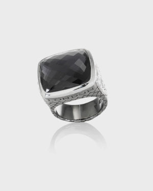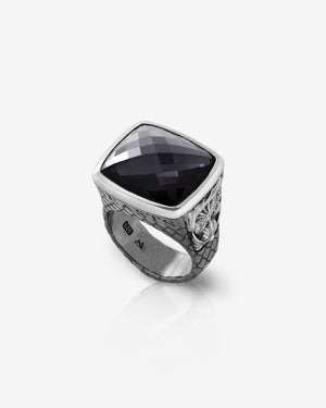 Discover the Embankment Fish Ring with a cushion cut Amethyst and Hematite Crystal Haze - crafted from Sterling Silver, black rhodium plated shank, with white rhodium plated panels.
