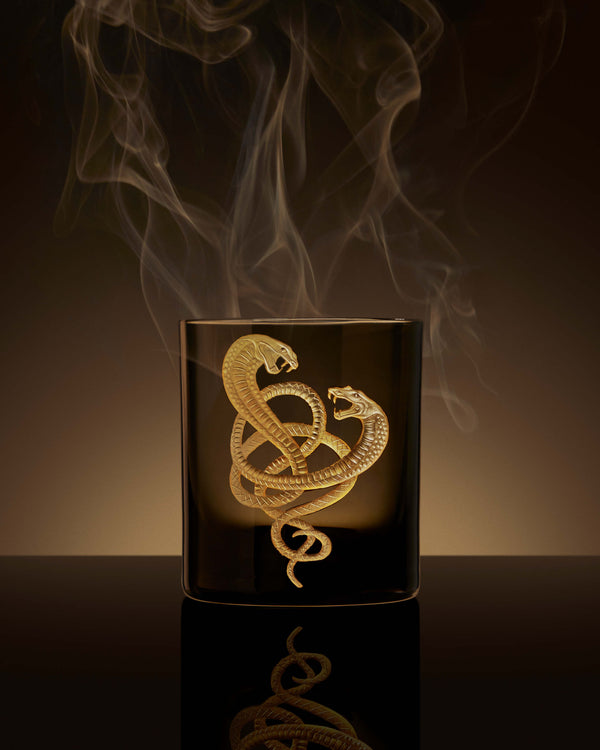 The Master & Serpent Double Old Fashioned glass with luxurious gold gilding, is crafted from Smoke coloured crystal, hand engraved with the Master & Serpent motif.