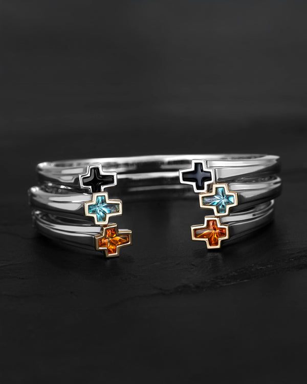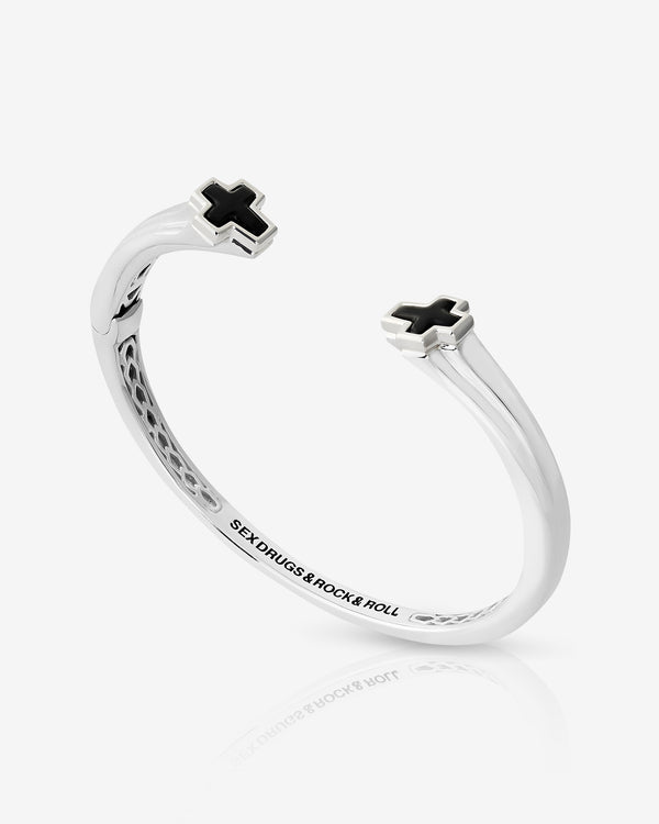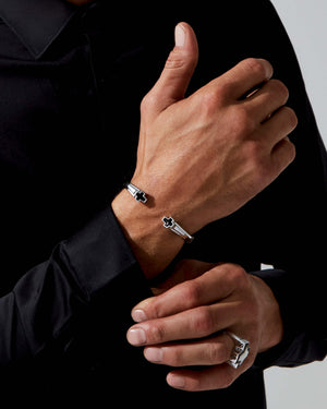 The Sex & Drugs & Rock & Roll Bangle is a defining spirit to the Men's collection able to be worn by men and women; handcrafted in Sterling Silver set with Onyx.