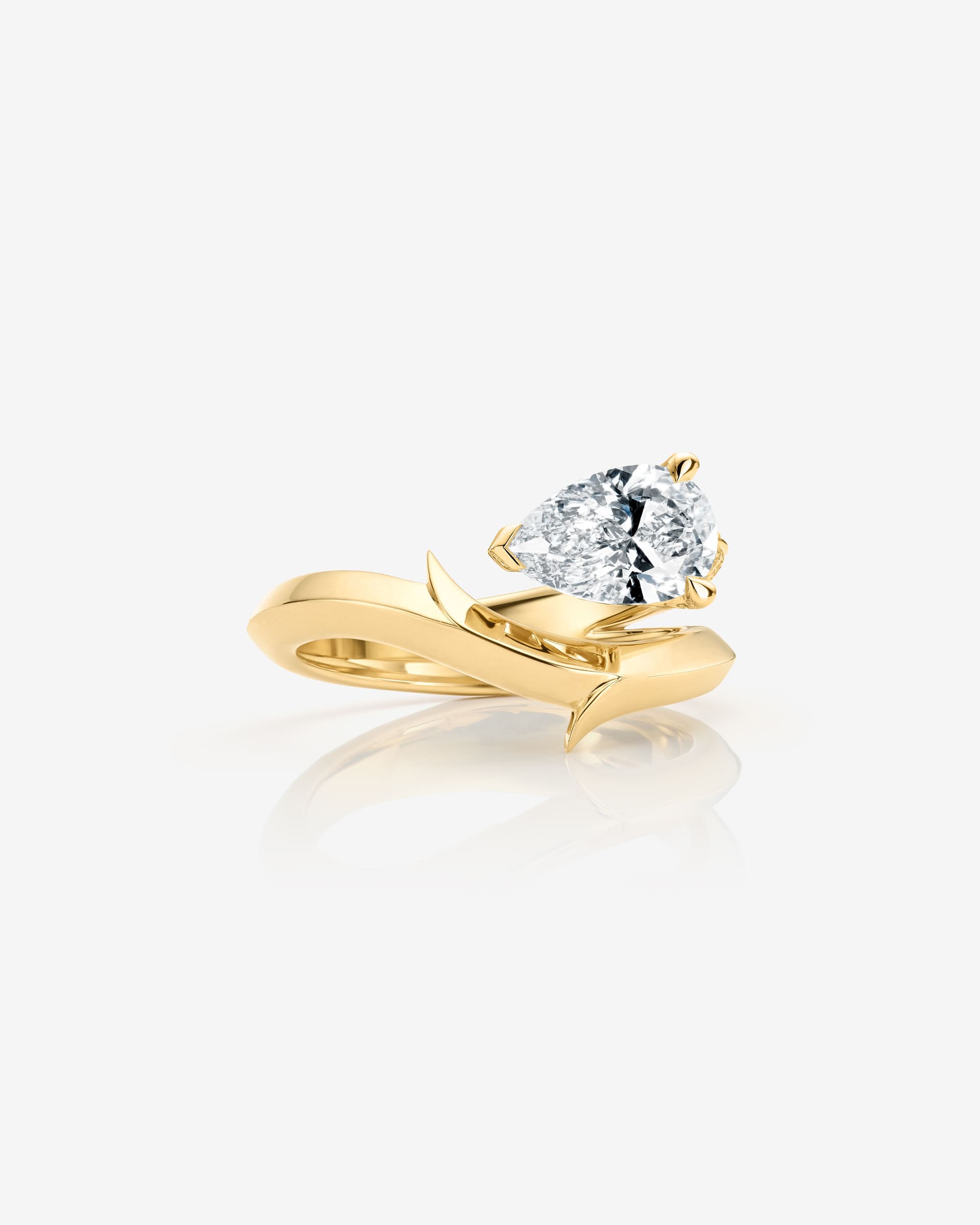 Minimalist yet striking, the 'Thorn Floating Solitaire' Ring is exquisitely crafted in 18ct Yellow Gold, set with a barbed band and central floating pear cut White Diamond.