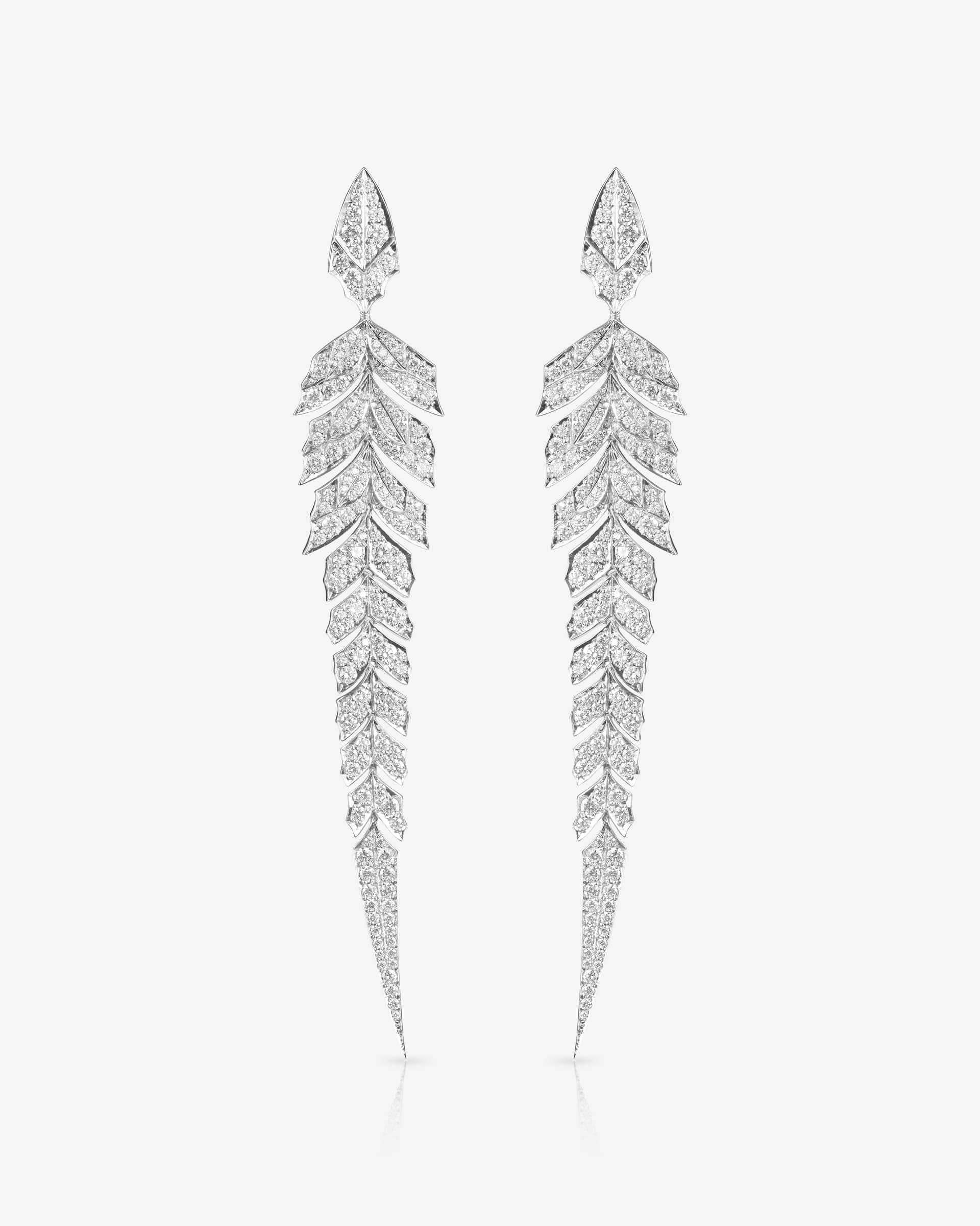 The timeless and glamorous Tail Feather Long Drop Earrings embody the magnificent pheasant's tail set with White Diamond pavé on articulated feather segments for alluring movement.