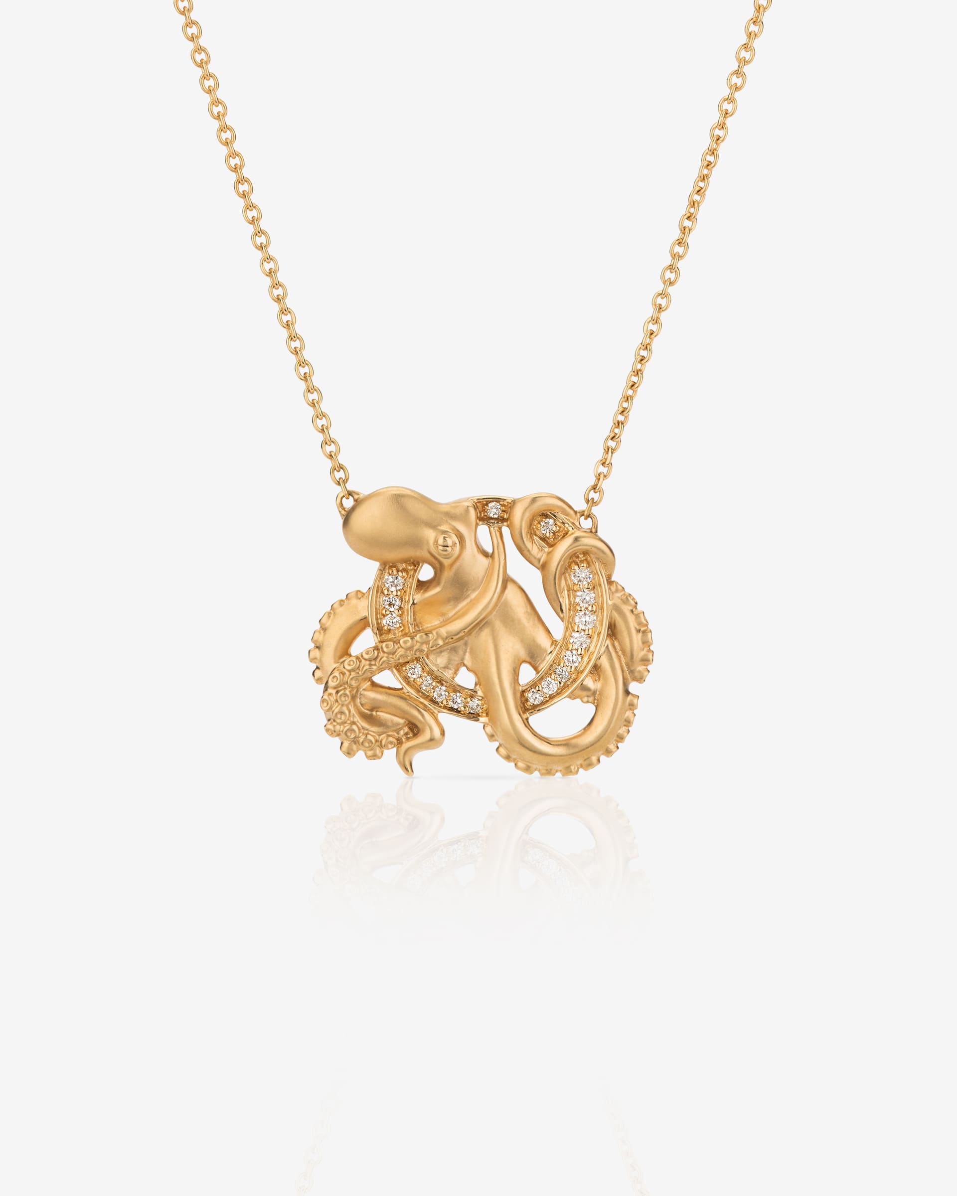 Inspired by Stephen's love of aquatic our 'O is for Octopus' diamond necklace is a personalised necklace like no other. Crafted in 18ct yellow, this matt finish octopus is intricately intertwined around a diamond letter O on a 42cm gold chain. Each necklace is accompanied with a short stories book entitled 'Fish Tales', which covers the A - Z of sea life.